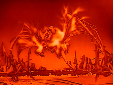 The intended effect was to make the actors look cartoonish so that they could fit into less realistic backgrounds. Action scenes were interwoven with shots of the ruins of a distant city. It was hoped that the stange coloration would distract the viewer from noticing that nothing was happening in the city.